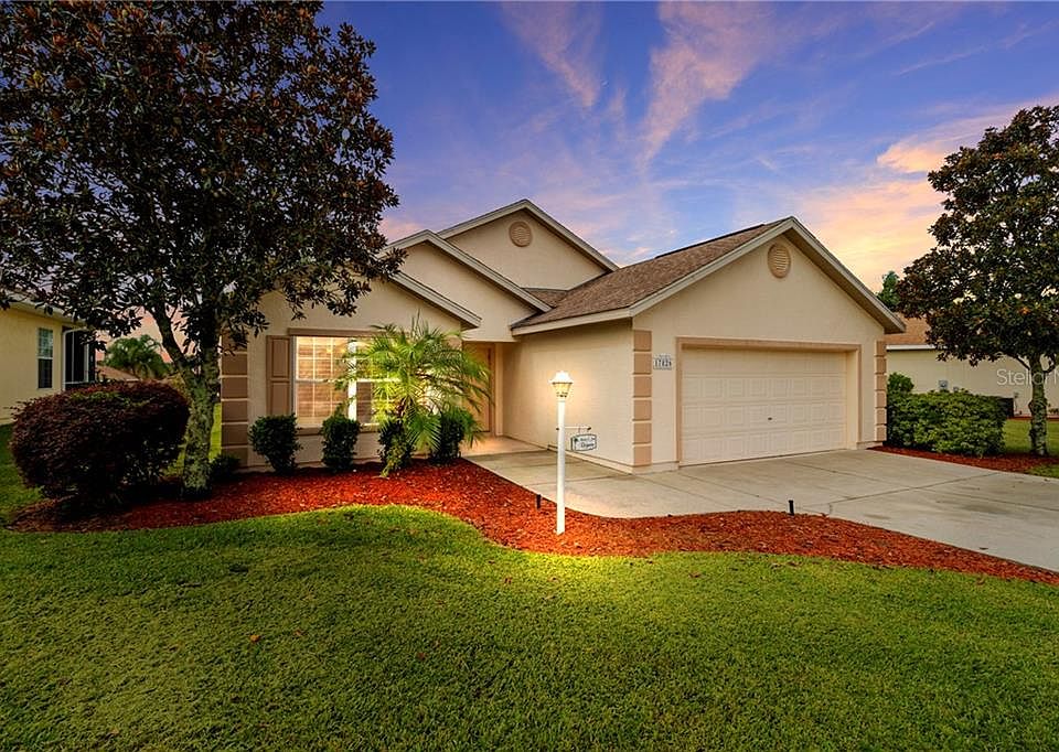 Located in the Exclusive 55+, Gated, Golf Community of STONECREST adjacent to THE VILLAGES, FLORIDA! You're going to LOVE the flow of this home, perfect for entertaining! 3 Bedroom, 2 Bath HICKORY Floor Plan with Vaulted Ceiling in Great room, TRAY Ceiling in Formal Dining room and Master. TILE and LAMINATE Flooring throughout, NO carpet! PLANTATION SHUTTERS throughout! HVAC replaced 2014. Kitchen with Island, Breakfast bar, Large pantry along with beautiful cabinets, smooth top electric stove and microwave hood. Master suite with large walk-in closet, dual sinks, separate walk-in shower with another linen closet. Enjoy your morning coffee or afternoon refreshment while relaxing in the Screened LANAI. Glass sliding doors across the back of living room leading out to lanai. Professionally landscaped yard with Palm trees in back of home! This one will not stay on the market too long. Schedule your showing before it's too late!