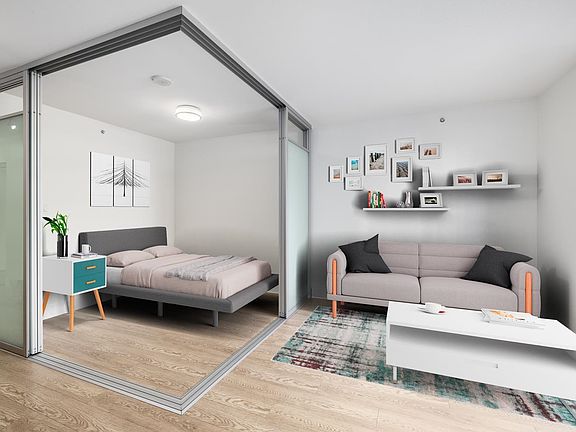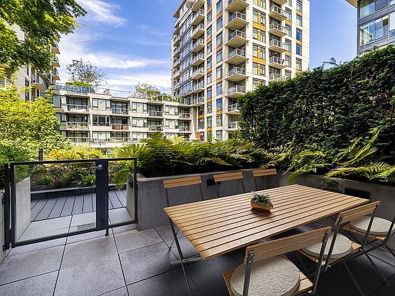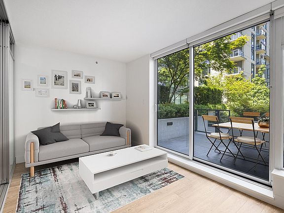 Rarely available junior one bedroom with over 80 sqft private patio on the quiet courtyard side. The floor plan is extremely functional with white oak laminate flooring, floor to ceiling windows and roller shades. The integrated 2-tone chef's kitchen is complete with quartz counters, Blomberg fridge, Fulgor Milano Cook top/wall oven and a stainless steel dishwasher. The bedroom is surrounded by retractable glass doors offering ingenious flexibility. Large entrance walk in closet / flex room with custom built-in closets keeping you organized. The Residence at West is a well run building including a gym, lounge and roof top garden. Located in Olympic Village surrounded by every amenity: Seawall, trendy cafes, restaurants and transit. Includes parking and storage! Pet and Rental friendly.