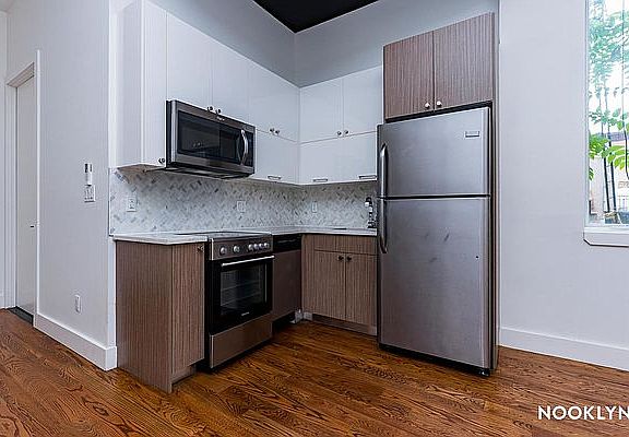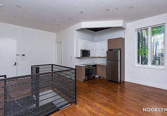 Large duplex with private backyard and patio on the Bed Stuy/Bushwick border. Two bedrooms upstairs + a large finished basement for recreation/office or whatever you need. Big private backyard. A/C units in all rooms. Dishwasher. Laundry on site. Great roof deck up top too. No broker fee! Bring offers for ASAP/Aug 15th moves.