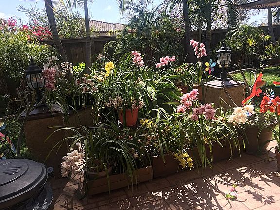 Corner lot. largest front driveway in neighborhood, it can fit 6 cars. Tropical backyard settings with multiple fruit and palm trees