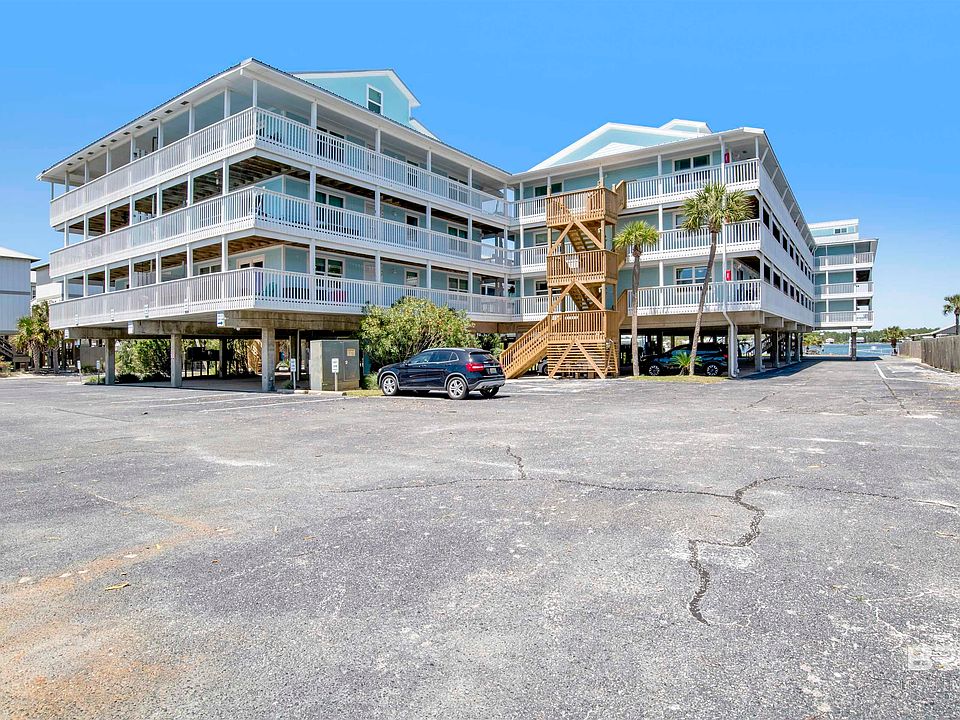 Welcome to coastal living at its finest! Nestled on West Beach on Little Lagoon, this first floor, corner, 2-bedroom, 2-bathroom condo offers comfort and convenience, along with amazing rental potential! Enjoy both Gulf and Lagoon views! Step inside to discover a thoughtfully designed interior with tile floors, new paint, wood accent walls. The living area opens onto a spacious patio, where breathtaking views of the lagoon await. Recent updates include new AC unit in 2021, interior doors & ceiling fans, windows, patio doors (two sets) and updated tiled bathroom showers. Includes two assigned parking spaces next to the stairwell and elevator for your convenience! The complex has undergone new updates such as new insulation, hardboard siding, and paint! With amenities such as a sparkling swimming pool, boat dock and slips, and easy access to the white sandy beaches just steps away, this condo presents an unparalleled opportunity to experience Gulf Shores, AL! Don't miss your chance to make this your own oasis!