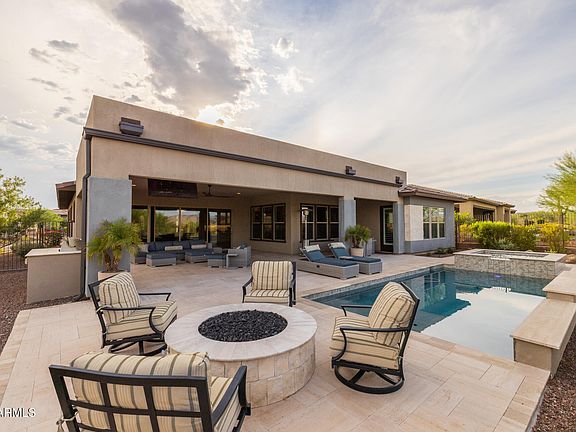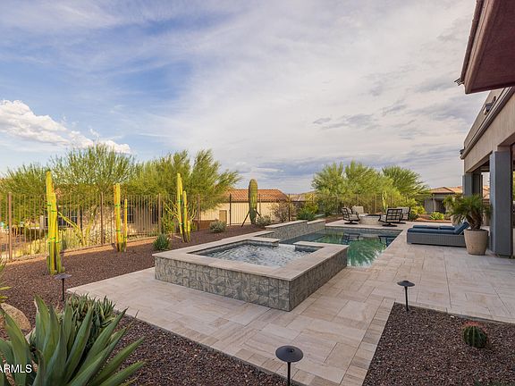 Experience the pinnacle of modern luxury in this stunning Vela floorplan, situated on an oversized premium elevated lot in the sought-after Trilogy at Verde River. Golf Membership available! This 3-bedroom, 3.5-bath home features a courtyard entry, private ensuite bathrooms for every bedroom, and high-end finished throughout. The chef-inspired kitchen is equipped with built-in appliances, a custom island with breakfast bar, and tile backsplash, seamlessly opening to a great room featuring a stone wall with built-in fireplace and surround sound. The primary suite is a true retreat, offering direct backyard access, a spa-inspired ensuite with soaking tub, large shower, striking chandelier, and a custom closet with shelving and drawers. The expansive slider leads to an indoor-outdoor living with the largest covered patio offered with the Vela model! You will love the resort-style backyard, complete with pool, spa with waterfall and mountain views to the north! The patio has a TV, fan, surround sound system, and three automatic Pro Shade sunshades that can fully enclose the space for added privacy. Entertain effortlessly with extensive travertine, a gas fire pit, and BBQ island. The 3-car garage is designed for convenience, featuring built-in cabinets and a 240V charging station for electric vehicles. Do not miss out on this gorgeous home!