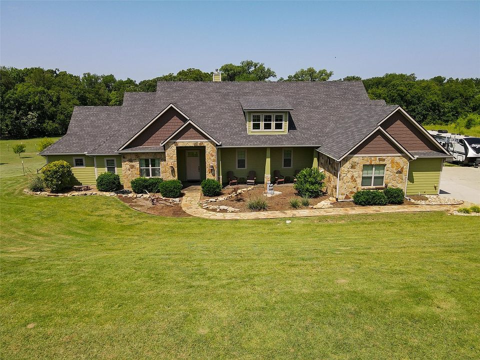 Fabulous Modern Farmhouse on 3.75 acres with 4 bedrooms & 4 baths. Gorgeous country views through the south facing wall of windows across the back of the house and from the huge covered back porch. Gas fireplace in the living room and private office. Kitchen has granite countertops, stone backsplash, gas cooktop, double ovens, and nice sized pantry. Large Primary Suite with huge window seat. Big primary bathroom with separate vanities, very large dressing room-closet with built in dressers. Nice sized secondary bedrooms with walk in closets and full baths. Plenty of built ins in the closets and area throughout the house. Large laundry room with sink and lots of cabinets. Drop zone with bench, hooks and cubies by the side door from the driveway and 3 car garage. Walk in Safe Room in the Garage. See the other amenities list in documents storage.