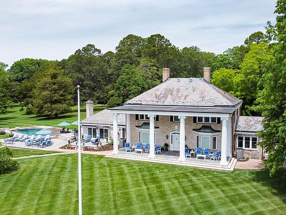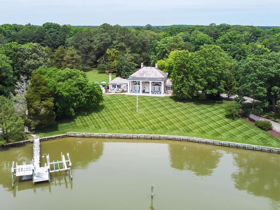 Prestigious Waterfront Home- Brick Georgian style colonial offers extraordinary, quality construction. Slate and copper roof,Impressive moldings, wood floors, finished basement recreation room, renovated custom top-of-the-line kitchen offers sub zero refrigerator, Wolf cooktop with griddle, 2 ovens, warming drawer, separate icemaker, and beverage refrigerator, wet bar and waterside breakfast room. Large dining room with built-in corner cabinets overlooking Bolingbroke Creek and the Choptank River. Family room/ Den with wood burning fireplace, bay window and built-ins. First-floor owner's suite with new bathroom, marble floors, fireplace and walk-in closet. The second floor has wood floors throughout, four bedrooms and three full baths. There is also a walk up attic for storage. The basement has bamboo floors, wainscoting, a pool table,and the extra finished room could be your exercise area. Expansive water views, deepwater pier with lifts, private beach, inground pool and hot tub. Front and rear flagstone-covered patios with massive columns make this home one of the more notable homes in Talbot County. Lavish outdoor infinity pool with sun shelf, spa and flagstone hardscape. Attached 2 car garage, paved tree-lined circular driveway with plenty of parking. A long peninsula juts into Bolingbroke Creek offers sweeping panoramic views across Bolingbroke Creek to the Choptank River. Deepwater pier with 2 lifts and special beach area for lounging or launching your kayaks. Privately gated 8 plus acres and 2500 ft +/- of shoreline. Septic is approved for four bedrooms. You'll feel like you are on vacation everyday! There are too many details to list. This is truly a must-see home! Call for more information. Not in flood zone!!!