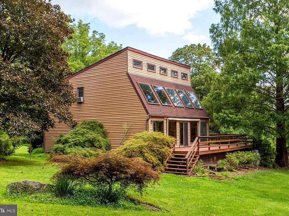 This one is Different!! 5+ Beautiful Acres of landscaped and wooded land bordering the Unami Creek. You need to actually see it to appreciate how beautiful it is. It is a private, rural road, but near Quakertown Shopping and Restaurants. Close to the Quakertown Exit of the Turnpike. Slightly more than 1 mile from Fox Hollow Golf Club. This home is very different from any other you have ever seen. It is a Passive Solar Heat Home with a full solarium-2 story Sun Room on the South wall with vents at the top, taking the sun-heated air into a "Double" Roof which carries the rising heat down through a gap between the double roofs to the double wall on the North side of the home and down through a 12" gap, into the basement, and back to the solarium with a vented floor to complete the circulation of natural heat around the home. The East and West walls are extra thick with extra insulation to help hold the heat. There is a cast iron, wood-burning stove in the Living Room that contributes to the whole home heat. There is also a smaller, supplemental Propane heater to add more warmth to the home. The first floor has a large Living Room with a sliding door to the Solarium, and Dining area, a Kitchen, and a full bath with a Laundry Room, Access to the Basement, and stairs to the 2nd floor which has 3 Bedrooms and a full bath. The Primary Bedroom has a large walk-in closet and a sliding door to a balcony overlooking the Solarium. There is a full, very dry Basement (where the passive heat passes through) with a full, new water conditioning system, shelving, and plenty of storage room. There is an oversized garage with a large area with a workbench with overhead storage, a sink, and lots of shelving for storage. This is NOT your typical Home! The owners never bought ANY heat until a few years ago when the small propane heater was installed. If the new owner wanted to live "Off the Grid" and still be near everything, they could put up solar panels and not have to buy electricity! There is a large deck with a large retractable sun awning outside of the Solarium with a terrific view of the Beautiful Grounds. The former owners were Plant People and planted MANY beautiful trees etc., including Redwood trees! Included in the sale are a Wood Shed and 2 Tool sheds, a John Deer Tractor with a hauling cart, Snow Blower, and Log Splitter. Yes, this one IS Different! A Must See! See Documents for a picture of property lines and a visual of Passive Solar Heating.