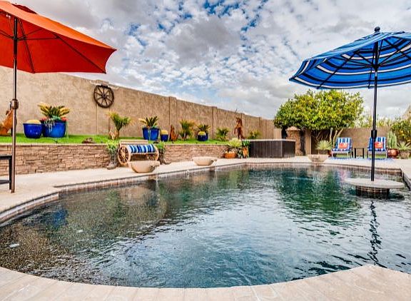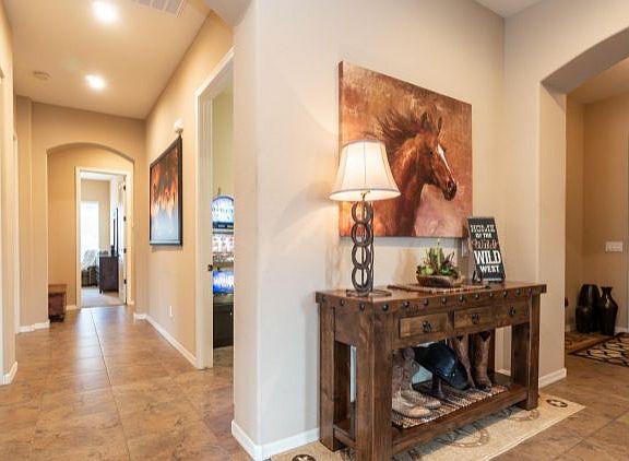Beautiful K. Hovanian home built in 2009, at end of CUL DE SAC. 3 CAR EXTENDED GARAGE, Beautiful DESERT VIEW FOR MILES! VIEW FENCE, LARGE HEATED PEBBLETECH POOL with 3 WATER FEATURES, surrounded by TRAVERTINE TILES. Above ground SPA for the best JET MASSAGE THERAPY. 4 Bedrooms AND 3 FULL bathrooms, PLUS DEN, AND GAME ROOM or DINING ROOM. Large living area looking out to beautiful backyard. EXTRAORDINARY SUNSETS. BUILT IN BBQ and BAR area, plus FIREPIT for nighttime FUN! Bring your OFFROAD TOYS, BOAT or Personal WATERCRAFT to your EXTENDED 3 CAR GARAGE and RV GATE. Some furniture and decorations are offered to come with the sale if desired - Living Rm couch and tables tv, master set, 3 guest room sets plus TV's. Game table chairs