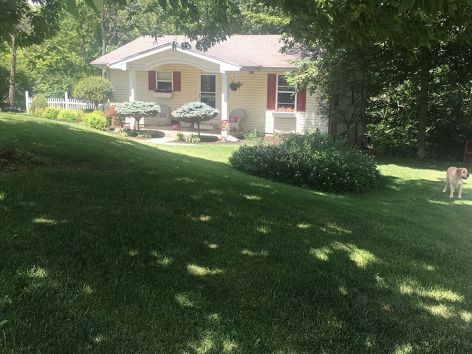 Great house in a private setting!! Two bedroom one bath home on 1.9 acres with laminate wood floors throughout the upstairs with carpet in bedrooms, newly remodeled bathroom with tiled floors and shower, basement is almost finished that adds another room that can be used for a bedroom/ weight room and a living area. Large storage room as well in basement. Large fire pit area great for sitting outside and relaxing!