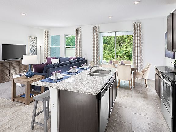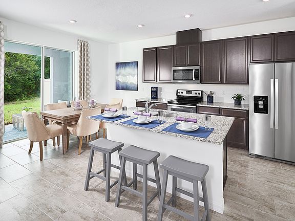 Enjoy conversing with family while preparing meals in this home's open kitchen which overlooks the great room. Dark slate cabinets, variegated granite countertops, light gray and white tile flooring, and white backsplash in our Premier Package.