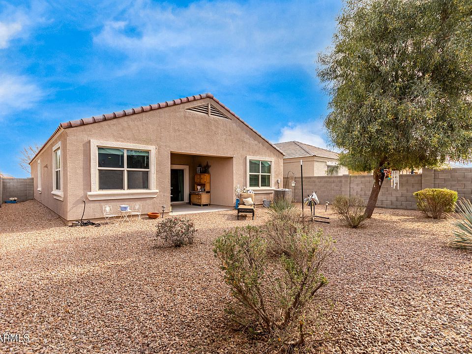 This home is eligible for a FORGIVABLE 4% down payment government grant, plus 5 years of FREE lender fees on RE-FI's. Terms apply. Welcome to this beautiful 3 bed/2 bath smart home in the growing city of Maricopa. This open concept floor plan offers an inviting space for the main living area with 16'' tile and 2'' faux wood blinds throughout & a ceiling fan in every room. The kitchen boasts gorgeous granite counters, a big island & plenty of cabinets plus a big pantry. The split floor plan gives added privacy with the master offering a big walk-in closet and his and her sinks. Covered back patio area, easy maintenance landscaping in both the front and backyard with irrigation. system. Great location-short drive to stores and shopping. Smart home technology features with keyless entry, built- in pest control system and hanging racks for ample storage in garage.