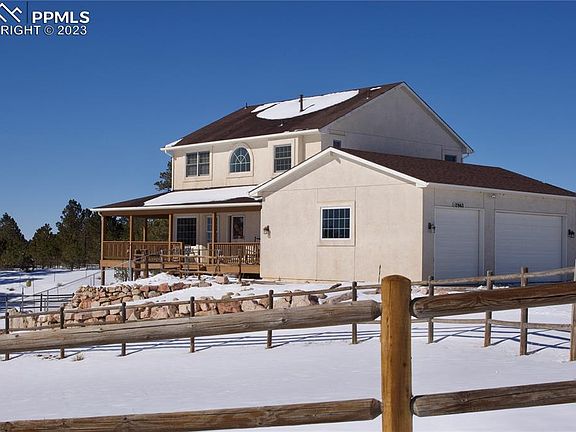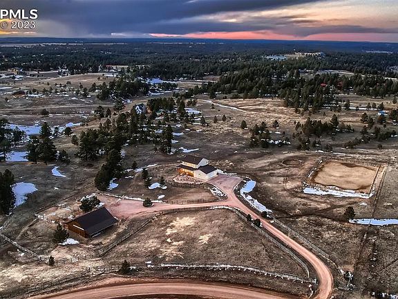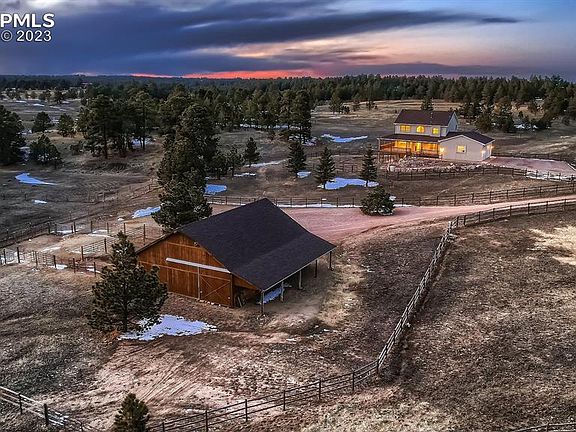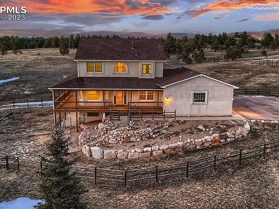 Welcome home to this peaceful 6+ acre property with beautiful grass pastures and rolling terrain in Peyton Pines, only 15mins from major grocery shopping and 30mins from Colo Springs/Peterson/Schreiver. Privately situated, this 2-story home with walk-out offers a wide wrap-around farmer's porch, ideal for outdoor cooking, gazing over your pastures or enjoying sunsets. The bright, airy hardwood entry opens to a study and a spacious, newly updated kitchen with abundant cabinet and granite counter space. Bay windows in the eat-in kitchen and dining room are bright and offer fabulous views. The living room features a cozy pellet stove, plus built-in shelving and storage. The kitchen, living, dining, and study areas are on the first floor, while the primary and two additional bedrooms are upstairs. The primary suite features vaulted ceilings and a 5-piece en-suite bath, while the secondary bedrooms share a large bathroom. The walkout basement is unfinished with a 4th bathroom rough-in, and offers another gorgeous view across the property. In the draw below the house sits a picturesque 36x48 timber-framed barn featuring: large barn doors on both ends; 12ft overhangs on the east/west sides for storage, trailer parking, or shade for animals; four removable 12x12 Priefert box stalls (with room for a possible 5th foaling stall); ample loft storage; water/electricity; and an enclosed office/tack room (with water tap for a future water heater). The stalls open to runs or a large corral which can be modified to accommodate 4 horses. Property includes a large arena, a perimeter fence with gating and cross fencing to create two separate pastures, each with water/electricity. Riders can enjoy the dirt roads within the community, venture to 450ac of nearby trail riding at the county's Homestead Regional Park adjacent to Peyton Pines, or travel 15 mins to Latigo Event Center for competitions and indoor riding. This multi-use property is flexible and ready for your great adventure!