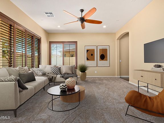 *ASSUMABLE VA RATE 3.375% NON-VA BUYER!!* Welcome to your MOVE-IN READY home in Estrella Mtn Ranch!! This GORGEOUS 3 bedroom plus den, 2 bath home offers an open & split floorplan w/natural light, HIGH ceilings, WOOD floors, CUSTOM split plantation shutters, gutters, NEW CARPET & exterior PAINT!! Guests are greeted by a private gate to your large front courtyard w/cobblestone pavers and room for outdoor lounging! Double-door den off foyer makes a perfect home office w/murphy bed sized niche optimizing space! Greatroom w/lots of windows is accessible from both hallways! Spacious kitchen boasts ample staggered cabinets, granite countertops w/full backsplash, pantry, island w/breakfast bar, large single sink, SS appliances, double ovens & gas stove! 3 car garage w/epoxy floor & EV charger! Generous sized master suite, bathroom, and walk-in closet! Great room, kitchen, dining area, and master suite offer views to large backyard showcasing both covered and uncovered patios, pavers, mature landscaping, and room for endless entertaining possibilities!!! Energy efficient!!! (see APS bill in docs tab). Located in Estrella golf course & lake community, and conveniently close to Presidio Resident's Clubhouse, pool, gym, and Cantina restaurant!!! Bring your best offer and start living the Estrella resort lifestyle!!!