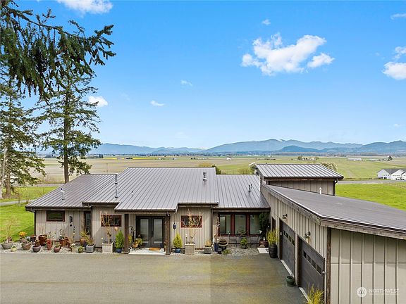 Wake to a Skagit Valley sunrise. Enjoy mornings overlooking tulip and daffodil fields in the Spring, with Mount Baker and the Cascades in the background. This custom-designed home was built by current owners in 2016. It sits on a 3.6± acre property on the highly desired Pleasant Ridge overlooking Skagit Valley. The home is designed for main level living and comfort. Featuring two primary bedroom suites, vaulted ceilings, beautiful wood trim, heated polished concrete floors throughout – even a steam shower! Plus, a loft office or art studio space with deck. All rooms focus your attention on the commanding view over the Valley. Over 1.5 acres of fenced pasture, gated pens and shelters, all provide a perfect environment for your farm animals!
