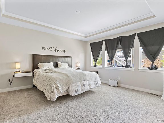 Welcome to this stunning ranch style home in the beautiful, outdoor friendly community of Candelas, perched on the edge of the foothills! This gorgeous floor plan includes a large primary suite, two secondary bedrooms with a Jack-and-Jill full bath, a powder bath, office, and spacious open kitchen featuring a spectacular center island and ample counter space with an adjacent dining space, and a comfortable family room area, all with plantation shutters, on the main floor. In the finished basement you'll find high ceilings, a great room with a wet bar, and an additional bedroom and bathroom. Enjoy the mountain views from the covered back patio, an oversized three car garage finished with epoxy floor coating and drywalled, and ample storage space throughout the home.