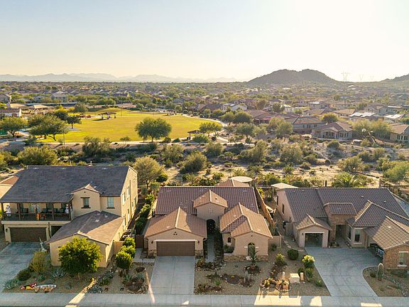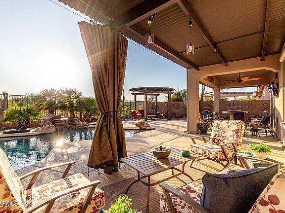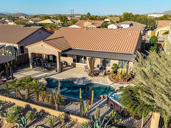 EVERYTHING YOU COULD ASK FOR IN A HOME! This premium view lot in Estrella Mountain offers amazing sunsets & ultimate privacy, backing onto a natural wash. Immaculate move-in ready, single-level, split floor plan! This open-concept 4-bed home boasts 8' doors, 20'' tile laid on the diagonal in all the main areas, LVP in all bedrooms, custom media wall w/lighting, crown molding and so more! The gourmet kitchen includes double wall ovens, UM lighting, quartz countertops, stone backsplash, large island, pendant lights & SS appliances. Cupboards in laundry rm. Resort-style backyard features heated pool with water features, spa, pergola-covered extended patio, outdoor lighting, pull down shade and more! Epoxy garage floors. This home is in pristine condition and meticulously maintained. Must See The backyard is a true oasispeaceful, private, and perfectly positioned for stunning sunsets. A beautifully designed pergola extension, fully HOA-approved and Goodyear-permitted, enhances the existing covered patio, and a second pergola creates an additional cozy seating area. A custom wrought-iron security screen door and select gutters have also been added. Some furniture, furnishings, and décor may be available under a separate Bill of Sale.