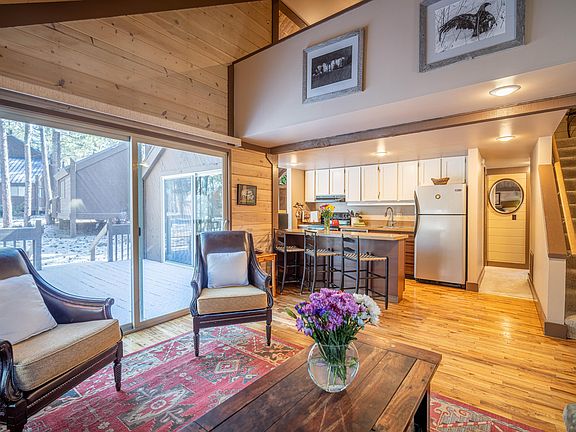 The iconic Sunriver Cabin 16 Pole House is a wonderful vacation get-away. With three bedrooms, two loft spaces, and two bathrooms, it provides ample space for guests. The unit features hardwood flooring, carpet, stainless steel appliances, and vinyl windows. With two deck spaces, perfect for stargazing or a nice soak in the hot tub or watching golfers on the Meadows Golf Course.