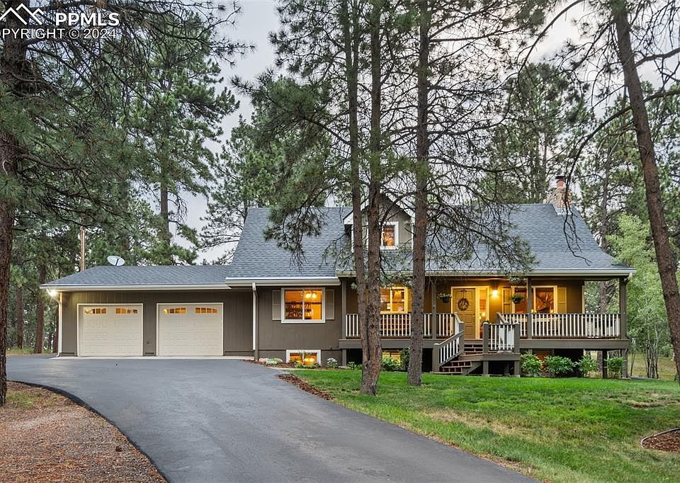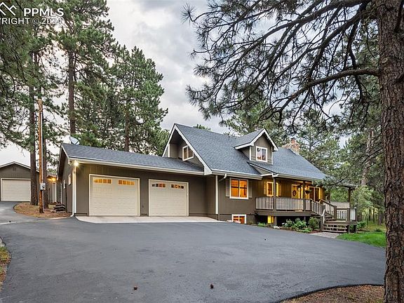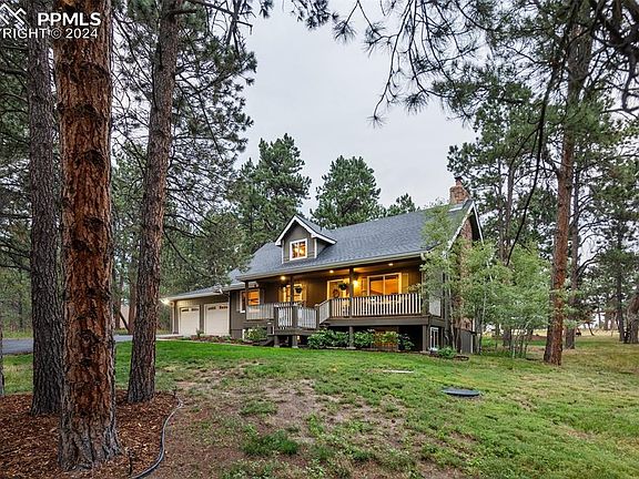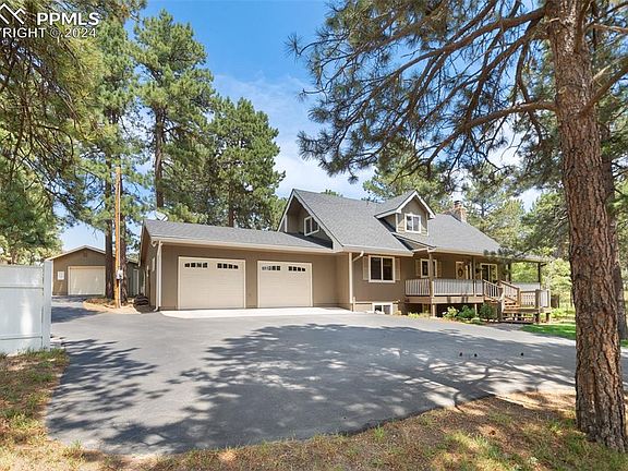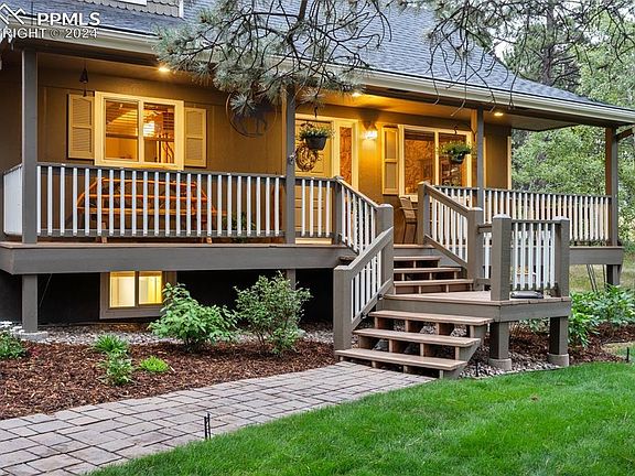 This spacious home with welcoming covered front porch is positioned for maximum privacy on over 5 picturesque acres. Once a model home for a custom home builder, this property has been tastefully updated and improved upon. This secluded paradise features 4 bedrooms, 3 baths, laid out in an open floorplan that seamlessly connects the large living, dining, kitchen and secondary dining areas. It is perfect for entertaining guests or enjoying a quiet evening at home. The gourmet eat-in kitchen features stainless appliances, wine refrigerator, custom cabinetry, granite counters, a large pantry, and ample counterspace perfect for meal prep or casual dining. The luxurious master suite offers a peaceful retreat with its spa-like bathroom featuring a walk-in shower with seat and heated floors. There is a large walk-in closet tricked out by California Closets. (The main level has a spacious bedroom with a large closet, and a full bath. This could be an alternate primary suite on main, if needed.) Some of the other highlights include: A Colorado Moss Rock Wall with hearth and firewood storage, a floor to ceiling, wood burning fireplace in the main level living room and a beamed ceiling. Downstairs (Garden level with beautiful light) is a large family room with a second wood-burning fireplace, two more bedrooms each with walk-in closets, a bathroom with walk-in shower, and a laundry room. There is an expanded, attached 2+ car garage with ample storage that walks out to the back yard. A detached 1+ car garage (room for motorcycles, bikes) with shop area and large storage room is situated behind the garage. There is an expansive 24 by 24 ft composite deck. There are 5 separate pastures, full fencing with electricity, 2 loafing sheds, and tack room. DOMESTIC WELL. It is the perfect property for vegetable and flower gardens, privacy and quiet, yet minutes to shopping, schools, entertainment. Time slows down here and allows a peaceful tranquility to soothe the senses. No HOA.