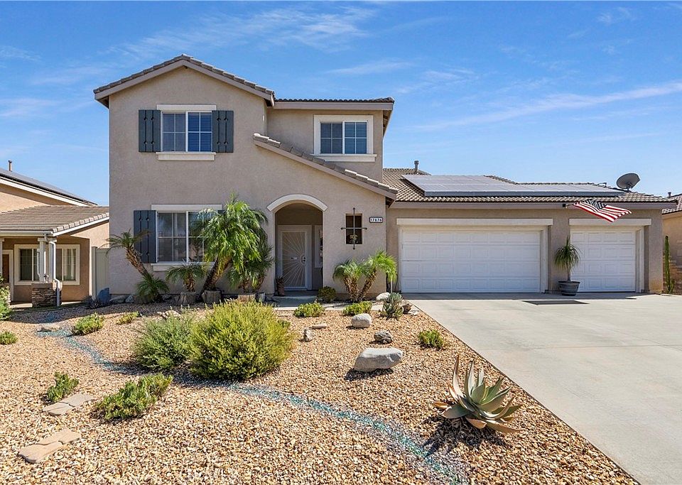 Lower interest Rates are available with the right loan program and credits. Spacious Victoria Grove Home. The curb appeal with beautiful landscaping will welcome you upon arrival. The first level is open and spacious with an abundance of natural light. The oversized great room is open to the kitchen providing a desirable open floor plan. The kitchen has granite counter tops including a breakfast bar, large pantry, great cabinet space and stainless-steel appliances, The great room also has an extended space providing the perfect area for a home office or playroom, has vinyl flooring, a welcoming fireplace along with access and a view out to your beautiful back yard and patio. The formal dining room is adjacent to the kitchen. The first level is complete with a good-sized bedroom and full bathroom. The upper level provides a loft for a 2nd den/entertainment room or create the "man cave" you have been dreaming of. There are 2 more additional bedrooms and a shared full bathroom along with the laundry room upstairs. The large primary suite is at the rear of the home providing a wonderful view of the hills and includes a large private bathroom with separate soaking tub, shower, dual sink vanity and very large walk-in closet. This home is well cared for and maintained allowing you to move right in. The back yard has lush landscaping with several fruit trees, a beautiful fountain and a covered patio that runs along the entire rear of the home. There is a built-in bar area complete with sink under the patio ready for your next Party. The side yard has an additional covered patio area with access to the 3 car garage. There have been many upgrades added including exterior electrical outlets, drought resistant landscaping, vinyl fencing along with Solar panels to reduce your energy costs. The community pool and parks make this one of the most highly sought-after communities of the area. Located near dining, shopping and easy access to the freeway add to the desirability of this location.