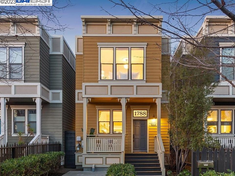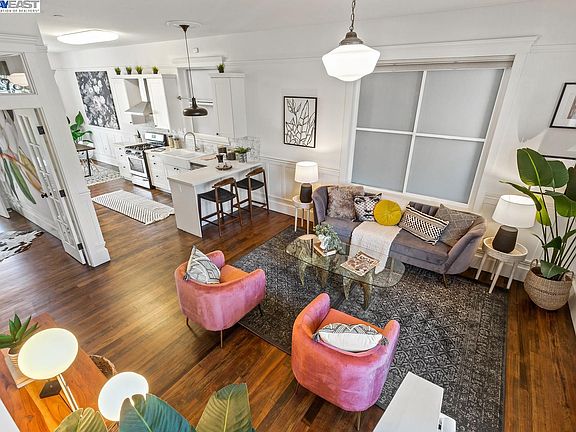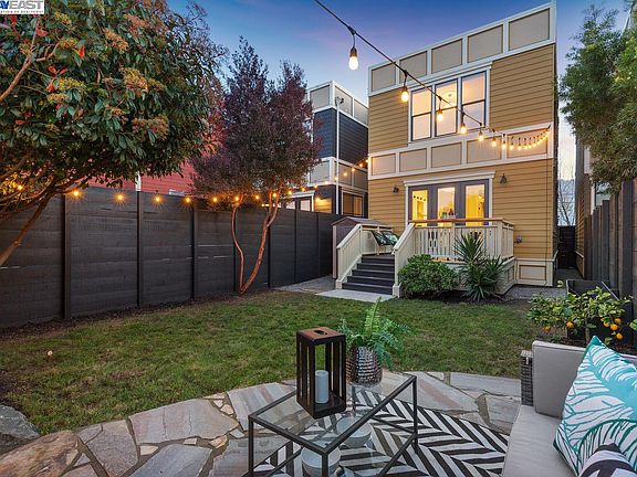 This picturesque 3BD/2.5BA two-story newly built Victorian-style home features 1605 sqft, sun washed rooms, and detailing including overhead lights framed by ceiling medallions, elegant picture frame wainscoting, and rich dark wood floors. Built in 2015 with modern convenience in mind, the open floor plan provides an effortless flow between the living room, kitchen and dining room while oversized windows deliver plenty of natural light. The spacious kitchen contains a gas stove, new dishwasher, and extra cabinet space. French doors lead to an adjacent bonus room – ideal for a breakfast nook or playroom. Bedrooms and full baths are located on the upper level for privacy, featuring crown molding and large sliding door closets. The primary bath enjoys dual sinks, skylight, and shower over a sunken tub – perfect to relieve the stress of a busy day. Also upstairs is a stackable W/D and additional full bath. The rear yard features a verdant lawn and wooden deck with handcrafted wood slab countertop, ready for outdoor cocktails and summer BBQs. This home is tucked on a block surrounded by neighboring renovated Victorian-style homes and charming tree-lined sidewalks. Close to: BART, weekly Farmers Market, Jack London Square, Horn BBQ, and Orbit Coffee.