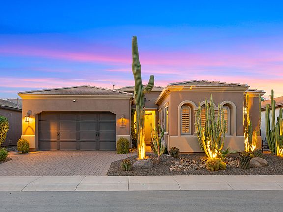 Experience the pinnacle of Encanterra living! Guests will enjoy the spacious bedroom with a sitting area, en-suite bath, and walk-in closet. The den includes a custom Murphy bed and built-in cabinets. The gourmet kitchen features a gas cooktop, stainless steel appliances, and a large double pantry. The smart space/laundry room is ideal as a home office. The backyard is perfect for entertaining with expanded travertine pavers, a gas fireplace, BBQ grill, and ample space. The pristine garage has an epoxy finish and built-in cabinets. With an 8-year pre-paid solar system, this home ensures low energy costs. Enjoy endless upgrades and exceptional living in this showstopper home.