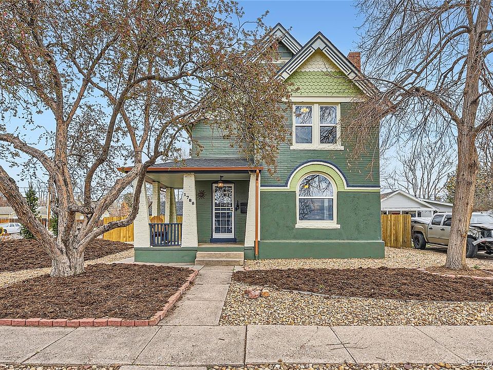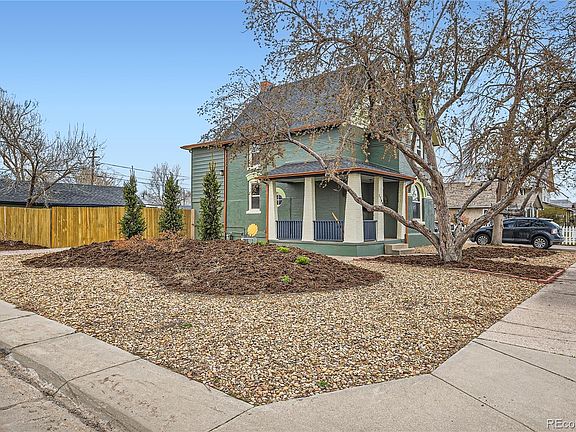 Step back in time as you walk through the newly landscaped xeriscape (2021) corner lot and up the steps to the lovely wraparound deck where you can enjoy a glass of wine in the evening. As you enter the spacious living room, marvel at the original tile mantle and wood burning fireplace. The high ceilings and exposed brick walls frame up the exquisite bay window as finishing touches to this one of kind living room. As you enter the custom kitchen (2022), yet more exposed brick walls, quartz countertops, soft close cabinets and new stainless steel appliances (including an induction oven). The newer main floor 3/4 bath features a tile floor and shower.