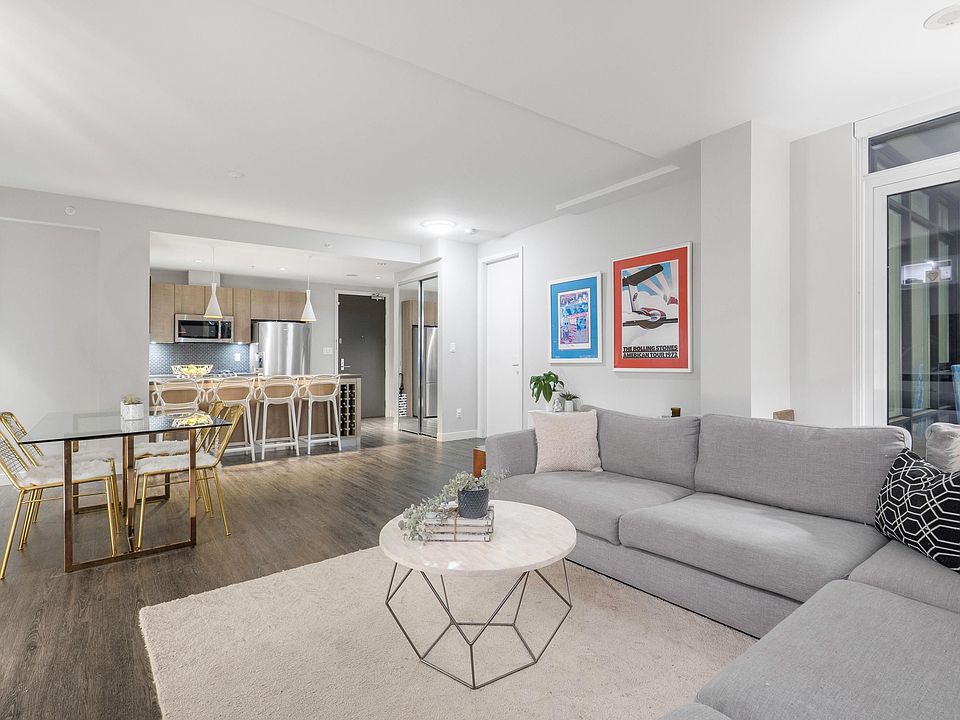 Welcome to Proximity in Olympic Village! Excellent location only steps to the Seawall, shopping, restaurants and everything you need in walking distance. This 2 Bed 2 Bath + Den home is spacious and perfect for entertaining. Corner suite with an open plan, 9' ceilings and separated bedrooms for privacy. Lots of outdoor space with two patios! Gourmet kitchen with quartz countertops and spa inspired bathrooms with heated floors. Amenities include gym, common room, boardroom, garden plots & spacious communal rooftop deck with lots of seating and fireplace. Well maintained building with proactive strata. In Suite Laundry. 1 Covered Parking Spot. Pets & Rentals Allowed.