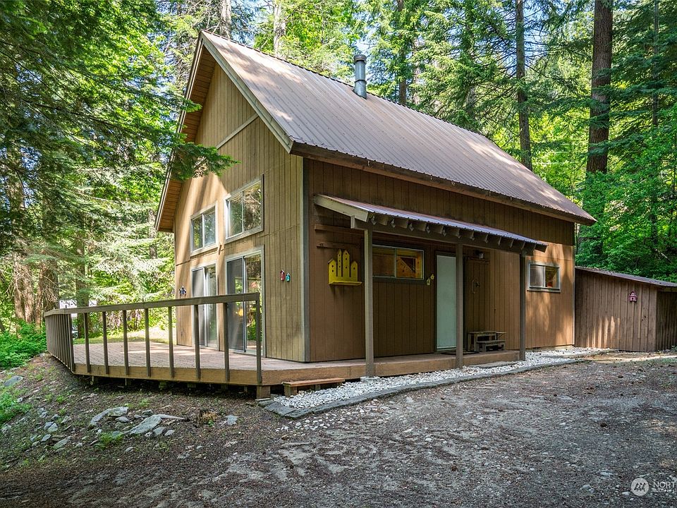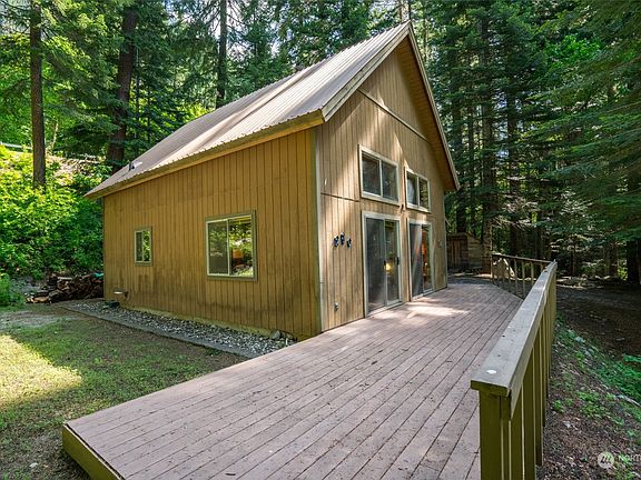 Looking for a relaxing four-season cabin in the mountains? You're going to love this 2-bedroom, 1-bath chalet set directly across the street from Lake Wenatchee! Open living room with vaulted ceilings, exposed beams, cozy wood stove, and tongue-and-groove paneling throughout. One bedroom and full bath on the main floor, together with a large open loft upstairs that sleeps many, and fully furnished. Beautiful views and lake access just down the street!