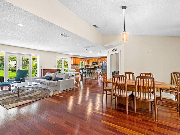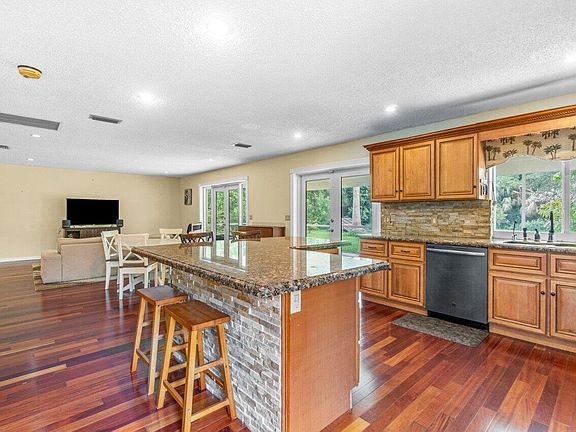 Private 4 bedroom, plus a den, one story CBS home with metal roof! Welcome home to large impact windows throughout, all overlooking the natural landscaping that makes you feel like your own private hideaway. Brazilian cherry wood floors in the main living areas and travertine in the baths and utility room. Spacious open floorplan is considered a great room with all rooms open and the den just off of the family room. The family room has double French doors (impact) that lead out to the covered, screened porch! Great to entertain and enjoy the outdoors! There is a large detached garage and carport, perfect for a boat and RV. The garage could be transformed into a working office space. Water treatment system and PV Electrical panel and solar panel for great savings.