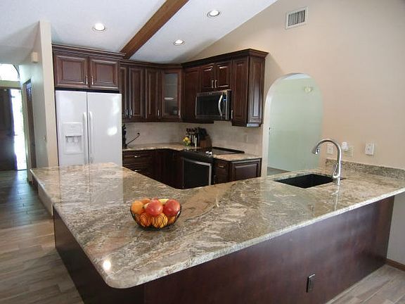 Beautiful 4BR split plan pool home on gorgeous 1.25 acre lot. Lots of upgrades including new granite counters, stainless steel appliances and new tile flooring thru out. Large Family Rm with fireplace and wet bar. spacious covered patio and very large screened patio. This is a very private lot with lots of palms, tropical foliage and Florida pines. The pool area is very private.