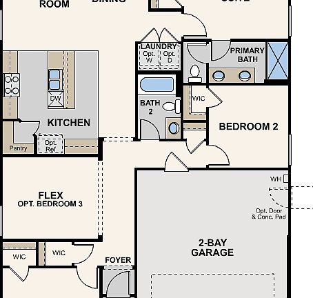 The Hibiscus plan's inviting single-story layout elegantly divides private living spaces from common gathering areas. Toward the front of the home, you'll find two secondary bedrooms, a flex room, and a full hall bath. Beyond the foyer, an expansive open-concept layout includes a kitchen with a center island and corner pantry, a casual dining area, and a spacious great room. Additional highlights include a lavish primary suite with a walk-in closet and attached bath, a laundry room, a two-bay garage, and a welcoming front porch. This home is currently under construction, and features the following options and upgrades: Corner lot White cabinetry White quartz countertops Hard surface flooring in main living area