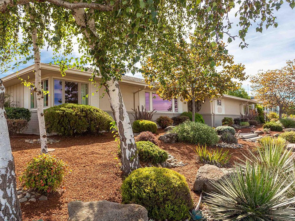 Nestled in the beautiful Bay O Vista neighborhood, this stunning mid-century home embodies serenity and sophistication. Thoughtfully revitalized, it blends modern features with luxurious amenities, creating a warm, inviting space that combines style and comfort. As you approach the front door with leaded glass windows, you enter an elegant foyer leading to a spacious formal living room featuring a striking wall of encasement windows and a charming fireplace. The adjacent dining room boasts crown molding and wide plank hardwood floors, inviting natural light and offering picturesque hill views—perfect for gatherings. Welcome to the dream kitchen, an updated oasis equipped with all the amenities a home chef desires, seamlessly flowing into an inviting family room with its own fireplace. French doors lead to a sprawling patio and landscaped, fenced yard, ideal for outdoor dining and entertainment. Retreat to the tranquil primary suite, featuring elegant encasement windows and a spacious bathroom with double sinks, a large tub, and a walk-in closet. Two additional bedrooms and a guest bathroom enhance the home’s sanctuary feel. Enjoy mid-century charm with easy access to Lake Chabot's natural beauty—it’s a wonderful place to call home!