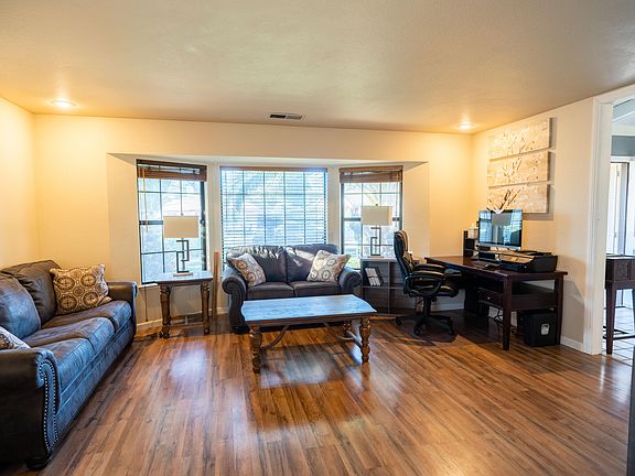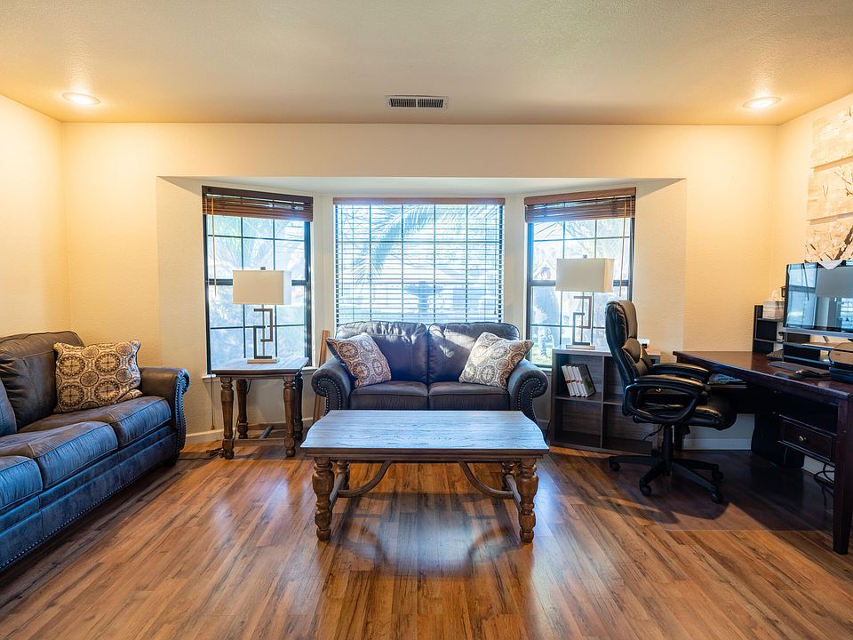 This stylish Somerset Estates home has a lot to offer. Stunning living room with wainscoting, dramatic vaults with enamel-painted plank ceiling, and fireplace with brick hearth PLUS a separate family room with bay window and perfect computer nook corner off entry. Tile kitchen with breakfast bar opens into spacious dining area, with upgraded light fixtures throughout. Private master suite with walk-in closet, covered back patio and separate outdoor space with gazebo. Mini-split in garage, recently replaced HVAC system, beautiful palm trees among the landscape upgrades, and recent flooring in bathrooms, this one definitely has all the boxes checked.