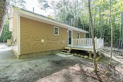 PETITE RETREAT, built in '18,with direct access onto the Frye Island golf course( 4th green) via a short path in the backyard. Maintenance free, one-level living cottage is darling. Vinyl siding, composite deck & rails on the porch and deck, and on a 4' poured concrete foundation. Consisting of LR, dining area,nicely appliance kit. w D/W, 2 bedrooms, full bath w washer/dryer. Many closets including a pantry. HVAC for heating and air. Enter via the front porch, the cottage is light filled, with laminate flooring throughout & a nice deck off the back. On the south is town owned vacant land and across the street is conservation land. Property is a short walk to one of Frye Island's many beaches/water access. Comes TURN KEY,sold nicely furnished! $2k credit at closing for a golf cart or to be used toward closing costs!