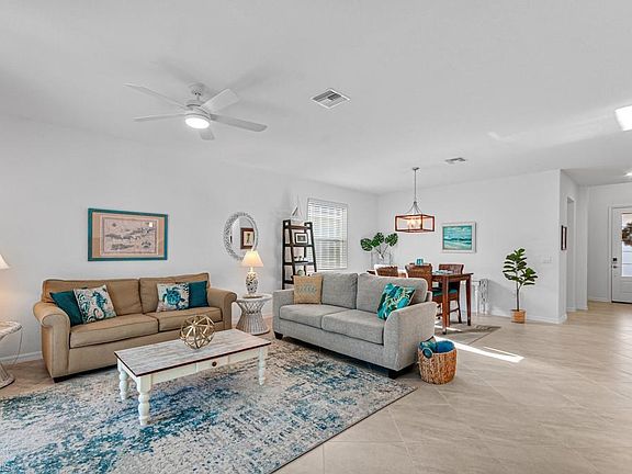 Must see! Priced to sell! This turnkey creampuff is primed to move in or rent. Lennar Alexander model, 3-bed, 3-FULL-bath detached single family home sits on a large corner lot. Pool ready! Fully furnished, including all major appliances, w/d, linens, fully stocked kitchen, new tv’s in living and bedrooms. Natural gas tankless water heater. Open concept floor plan, neutral colors, tile, crown molding. Upgraded kitchen with quartz style countertops, stainless steel appliances, walk-in pantry. New mattresses in all 3 bedrooms and all new furniture suites in 2. Primary suite features 2 walk-in closets, en suite bathroom, dual sinks, XL walk-in shower. Screened back lanai with lake view. Front porch provides covered seating area with views of lovely open community space. Excellent rental income potential. Community amenities include shopping, dining, pools, social events, health/wellness lifestyle facility. Walking distance to high school and all new 23-acre William and Mary Ann Smith Sports Complex. Check out everything this home and unique solar-powered community have to offer!