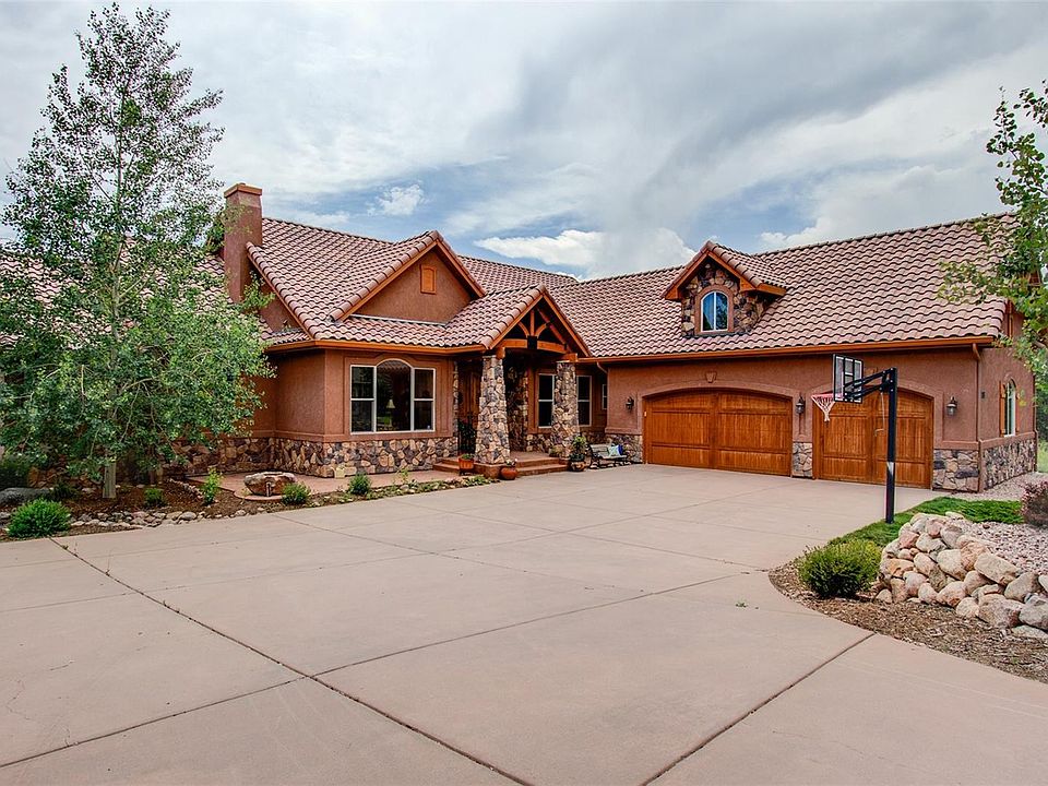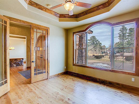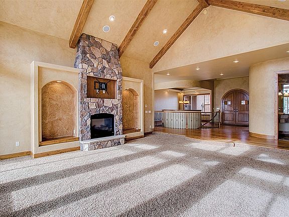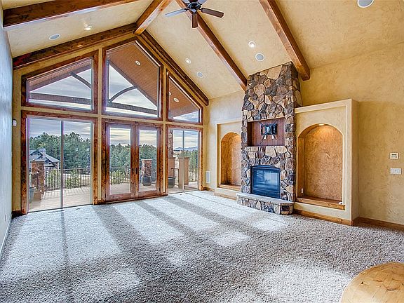 Beautiful stone and stucco craftsman style custom home in the area of Walden Preserve on of an acre with Pikes Peak views and within walking distance of the elementary school. Custom French doors open into the alder wood entryway which then opens to the formal dining room with a custom table with a custom stone pedestal. This open floor plan leads you right into the spacious vaulted great room that features; beamed ceilings, a wall of windows to bring in Pikes Peak views, French doors that lead to the covered composite deck and a 2-sided ceiling to floor stone fireplace with arched built-ins on either side. French doors open into the office and has a coffered ceiling with crown molding, built-in bookcases and a beautiful picture window for plenty of natural light. The gourmet kitchen is a culinary dream come true with top-of-line stainless steel appliances, 2-ovens, 2-dishwashers, 2-sinks, custom built-in refrigerator, a wine fridge, pantry, slab granite countertops, tile backsplash & hearth area or breakfast nook w/ fireplace. The vaulted main level master retreat has a stone wall with a 2-sided fireplace, attached sitting room, plantation shutters, a walk-out to the deck and a 5pc spa with jetted tub, walk-in shower, a spacious walk-in closet. Completing the main level is a secondary bedroom with an attached bath and a laundry room with built-in cabinets. Lower level features; 9ft. + ceilings, a large walk-out family room with built-ins, a wet bar plus an attached game room with a 3-sided fireplace. Completing the lower level are three additional bedrooms with attached baths and walk-in closets. Extras; AC, 2 furnaces, 2 hot water heaters, stamped concrete patio, fully landscaped with custom finishes throughout this true Colorado home. A must see!