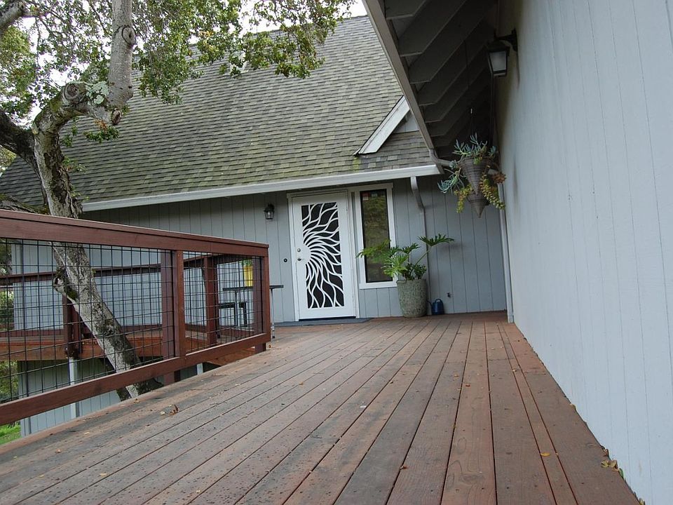 The living room features floor to ceiling windows to enjoy the natural setting and let the sun shine in. Stay warm with the wood burning stove that warms up the whole house. The slider takes you out to the wrap around deck to enjoy the outdoors. Master bedroom sports a coffee bar with a sink, two walk-in closets and a balcony to enjoy the beautifully maintained back yard with mature oaks and fruit trees. Along with your own rose garden and quaint sitting area. Master bath has two skylights, large jet tub and electric fireplace. Beautifully tiled shower with duel shower heads. Property has a seasonal pond and two fenced pastures for animals. Shop has a loft for storage, and there's more storage under house where you'll find the Rain Soft water system. This house also offers an owned solar system, panels are approximately 5 years old, sellers average PG&E bill is $10 a month. There's also Rv parking with hookups and solar lights throughout the property and so much more.