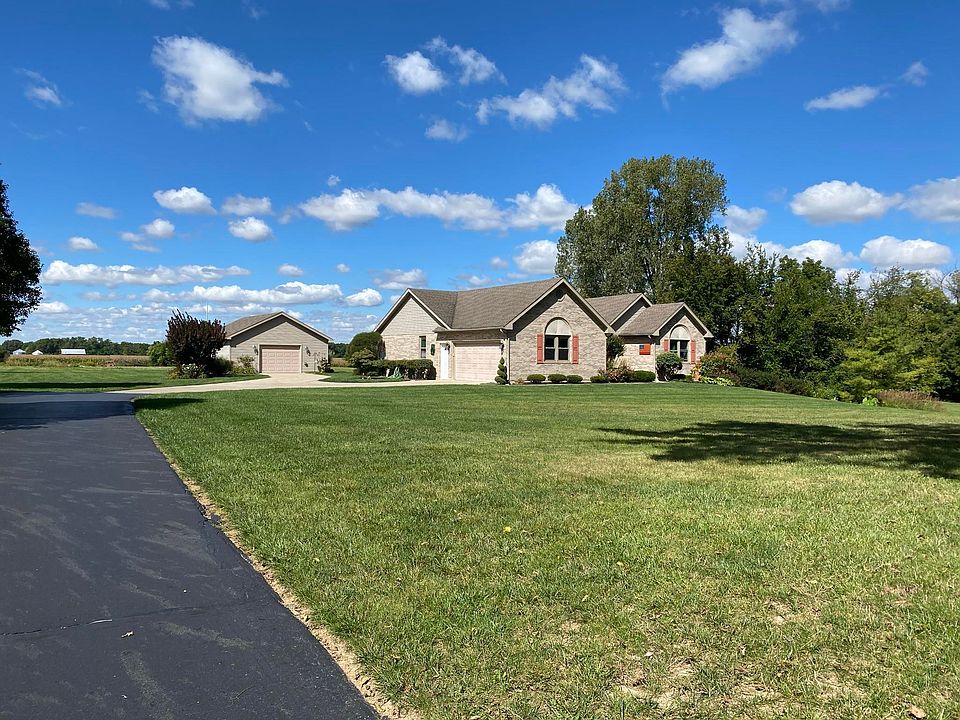 Hard to find very beautiful full-brick ranch home with poured concrete fully finished walk-out basement on over 3 acres. 3600+ live-able square footage. Plenty of room for a home office or two. Granite counter tops accent the kitchen and a custom bar in the basement. This home is loaded with outdoor living areas! The North side of the house features a shaded and very private oasis with a bar and lounge area. Or, you can view a lot of beautiful sunsets to end the day on a built-to-last composite deck that faces the West. Lots of space either in or out, the home allows plenty of room for most and several areas to find peace or comfort. There is a bonus 1+ car oversized detached garage workshop with 200 amp service and additional attic storage in addition to the attached oversized two car garage.
