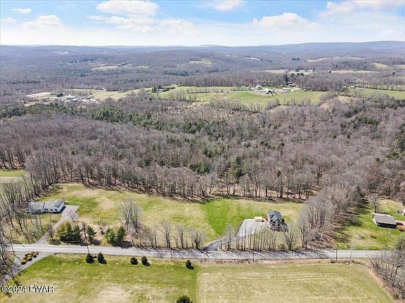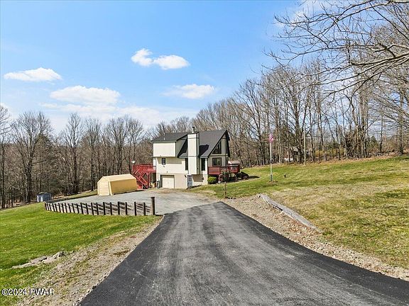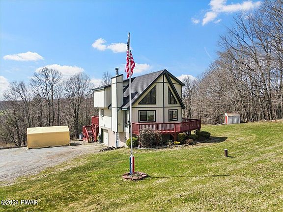 PRICED TO SELL! Peaceful Chalet sits on beautiful 16.89 acres of land with an open field and woods. NO COMMUNITY. This Property Invites You to Escape into the Perfect Blend of Nature and Comfort! Custom Designed home has an open floor plan with hardwood flooring, Cathedral ceiling, Living room wood fireplace, 2 bedrooms plus Loft, Oil heat, 2 A/C heat pumps, central Vac, 50 years Galvanized metal roof, new windows, stainless steel appliances plus includes the freezer and washer/dryer, work benches. The sunroom is currently an office leading out to private sun deck relaxation, the lower level is great for a future family room, and 1 car under garage. Plus a Shed for the toys. Basic furnishing included. Minutes to I-84, Shopping, 4 Season Activities & Lake Wallenpaupack. GREAT CENTRAL LOCATION ~ GEM FIND!