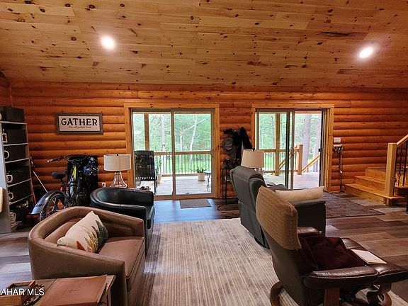 If you have ever dreamed of living in a log cabin in the woods, but are not interested in ''roughing it'', take a look at this beautiful home. Sit on the full front porch and watch the deer and other wildlife. Step inside to the open great room with a cathedral ceiling. The kitchen boasts hickory cabinets and stainless steel appliances. The first floor bedroom, bath and laundry offers one floor living if that is what you are looking for. But you will want to slip up the lovely staircase to see two large additional bedrooms sharing a Jack and Jill full bathroom.