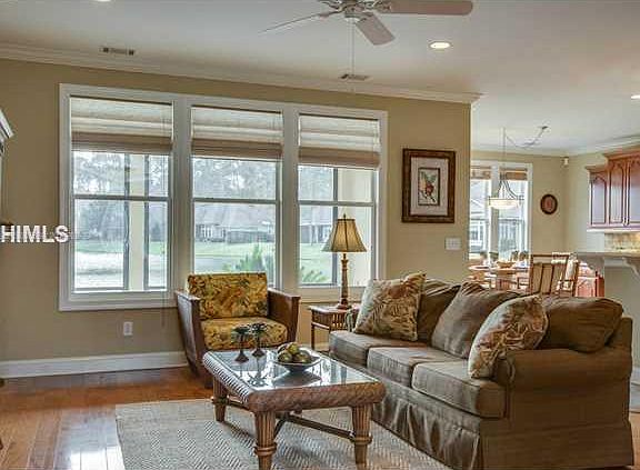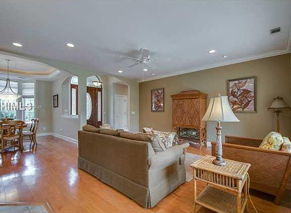 Glorious lagoon views at this beautiful custom home in Riverbend, Sun City's exclusive gated community situated on the banks of the Okatie River. 3 bdrms+Bonus rm, 3 full BA. Features a wonderful kitchen w/granite, cherry cabinets, pull-out pantry,+2nd pantry, gas cook top, & desk area. Dining area w/bay window +breakf area, wood floors in main rooms, custom front door, tray ceiling w/cove lighting, comfort-height toilets, 40 yr roof, coated garage floor, 2 AC units w/ 2 zones & 3 thermostats, & a screened lanai accessed by 2 doors, 2 car garage w/space for golf cart. Home Warranty Included (909113)