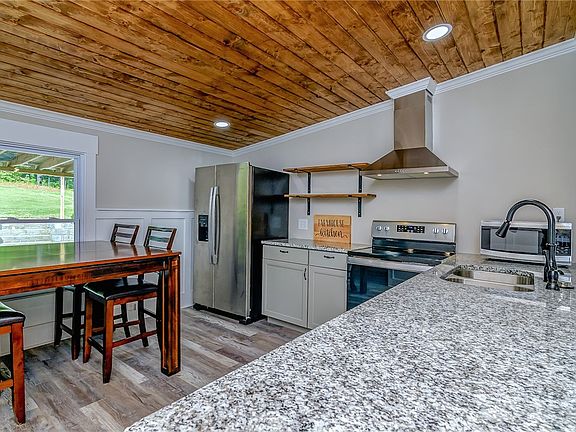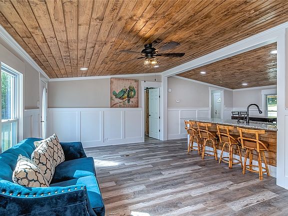 Back on the market, due to buyer financing. Quiet, country living at its finest! This fully renovated 3 bedroom, 2 bathroom mobile home on a permanent foundation has everything you need and is situated on over 2 acres of land with a gated driveway. The deck at the front door leads you into the open great room and kitchen with gorgeous, custom tongue and groove wood plank vaulted ceilings with recessed lighting, custom trim work, and modern LVP throughout. The kitchen is equipped with breakfast bar seating, granite countertops, new cabinets, Stainless Steel appliances — smoothtop stove/oven, over range hood, dishwasher, counter microwave and refrigerator. The Master bedroom features a custom accent wall with built-in headboard and barn doors to walk-in closet and bathroom. The Master bath has tile floors, granite vanity, tile surround shower and linen closet. Two additional bedrooms, both with barn doors to the closets, share the hall bathroom with tile floor, granite vanity and tub/shower with tile surround. Step outside to enjoy your morning coffee, afternoon BBQ or evening quiet time on the oversized covered patio that leads to the oversized open, uncovered patio… continue up the steps of the retaining wall to the fire pit! Additional features include: thermal windows, fully sheet rocked walls, new roof, new HVAC, new light fixtures/ faucets, etc. Storage building is included and sold as-is. Write your offer today!