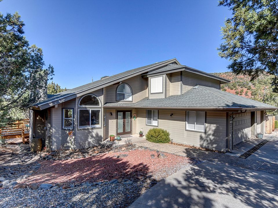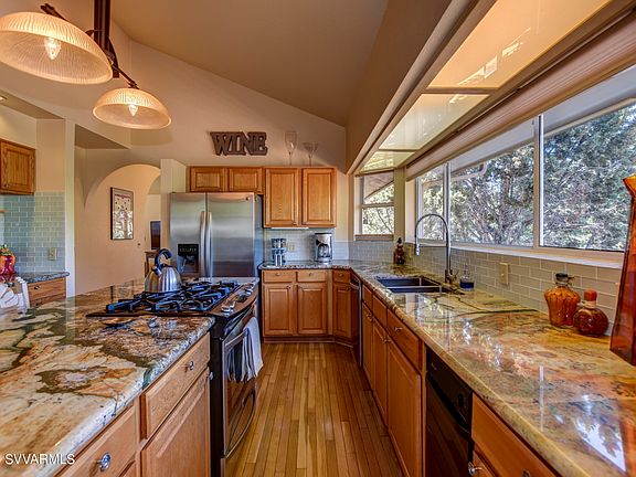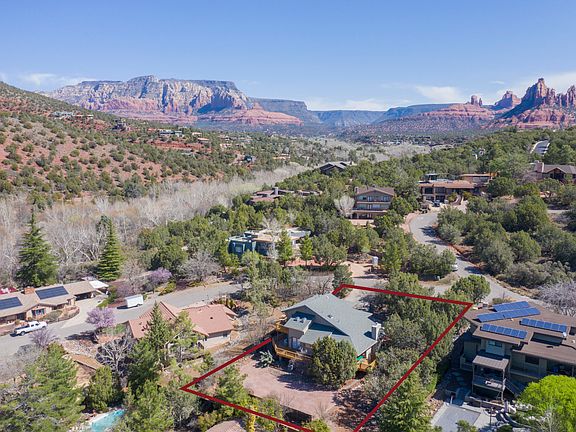 Rare GEM offered in coveted Doodlebug area. Fully furnished and supplied AirBnB. Nestled on top of hill with tree top views of Red Rocks. Magnificent 60ft ''wrap around 2 story deck'' Architectural designed for great space with skylights, vaulted and cathedral ceilings on both floors. Recent updates include new granite countertops, bathroom upgrades,stainless steel appliances. 1st level formal living room, kitchen, dining room and breakfast nook. Gourmet kitchen with walk-in pantry and fabulous views.Primary bedroom and bath featuring Jacuzzi tub on main level then spiral staircase leads to family room, 2 bedrooms and craft room on 2nd floor.. A stone's throw from cascading waters cascading waters of Oak Creek. Meticulously maintained