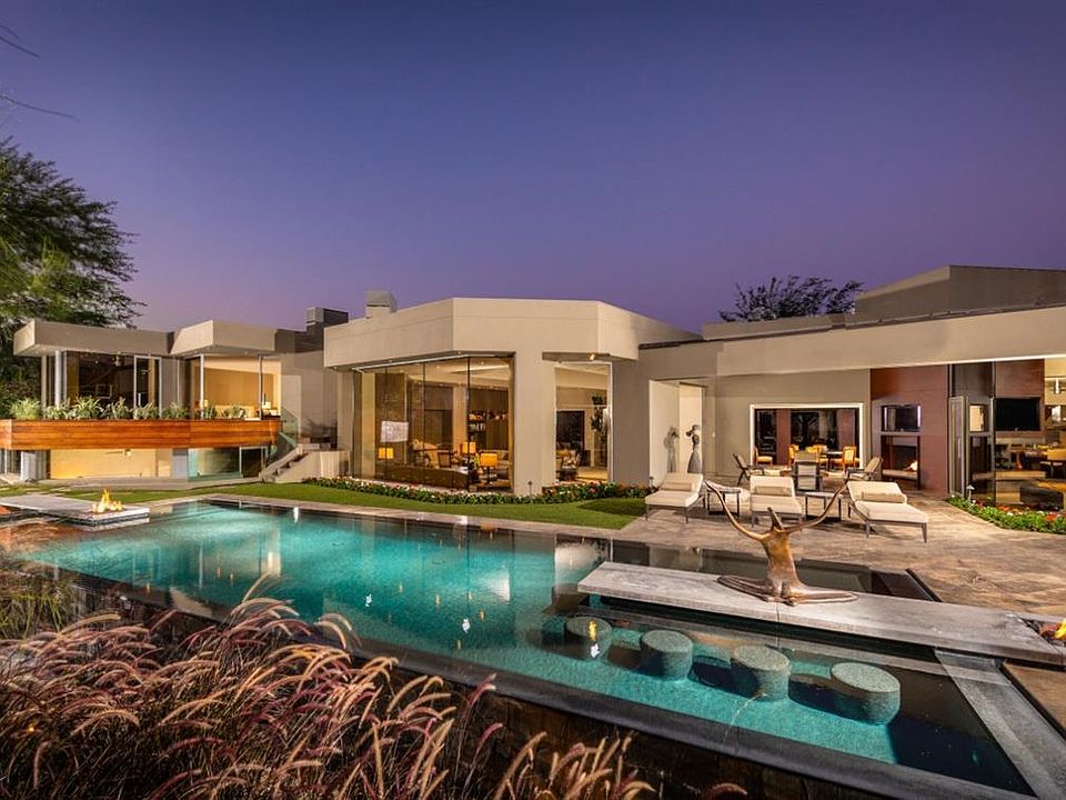 Tranquil Modern Estate has been recently remodeled and renovated by world-renown architectural and interior designer Terry Hunziker. Architecturally stunning. This desert modern home greets guests w/a porte- cochere driveway and two reflection pools. The inviting foyer transitions to an elegant yet desert casual living room, featuring floor-to-ceiling glass galleries showcasing breathtaking mountain, double fairway and lake views, vaulted ceiling, custom designed gas fireplace with brushed steel finishes. Every detail in this home has been carefully and intentionally designed. Organic finishes and materials create the refined desert oasis environment. Full movie theatre with wet bar and powder room make for a perfect place to entertain or spend a quiet evening at home. Master bedroom boast floor-to-ceiling windows enjoying the majestic mountain views, fireplace, sitting area, and separate office. Spa-inspired master bath offers ultimate pampering. Extensive indoor/outdoor living.