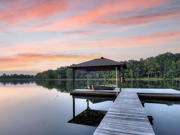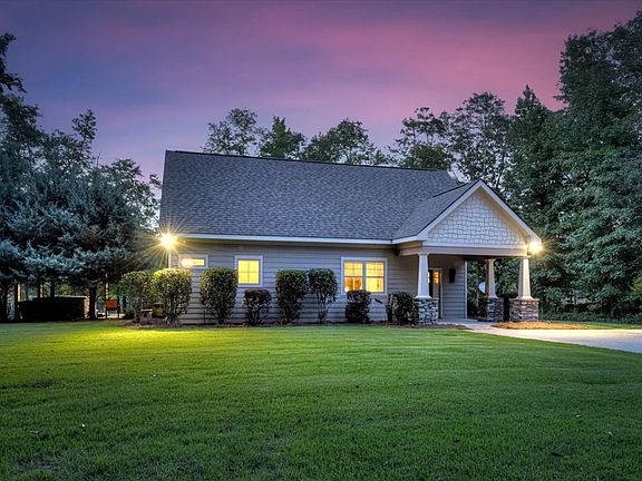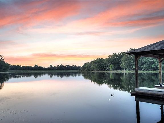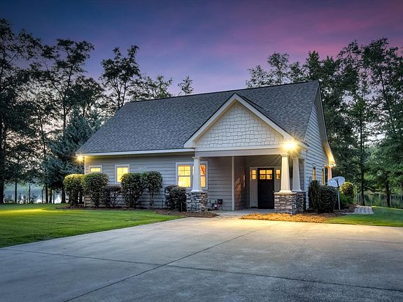 Own your own slice of heaven!! Absolutely stunning view of 37 acre lake from this home. Enter into this private location through magnolias to find this hidden GEM. Thoughtful design and construction in this home. Open floor plan with custom kitchen which features soapstone countertops, stainless appliances and open shelving. Custom milled white oak flooring from Tennessee! Primary bedroom on main level features a beautiful, ensuite bath with glass shower and multiple shower heads. Half bath off the kitchen. Second bedroom upstairs. Large windows and patio doors take advantage of the spectacular view. Large patio of pavers with hot tub and fire pit overlook lake. Covered dock awaits your small boat or kayaks. Concrete area for parking at entrance. New out building/storage shed added in last few months. This opportunity won't last long. With 4 acres, you have room to roam, garden, or bring your horses! Come make your dreams come true!