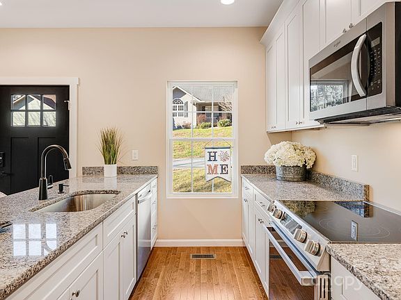 Kitchen and great room are chef’s delight: prep space, peninsula breakfast bar, stainless steel appliances, solid wood cabinets, and granite counter tops. Powder room for guests.