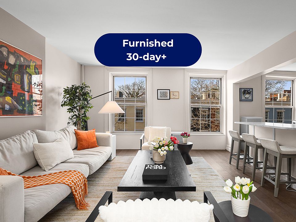 A walk-in kitchen and separate dining area complement the unit's main space. The oversized bedroom features a queen-sized RH bed and plush mattress, as well as a desk & monitor for those working from home. Featuring soft lighting and hotel-quality linens, the bedroom provides an ideal setting for unwinding after a long day. The newly-renovated (& windowed) bathroom houses the unit's washer-dryer. This unit offers business-speed Wifi, as well as a Nespresso machine and other modern conveniences.