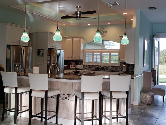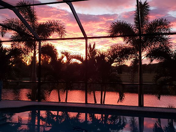 Located on a beautiful manicured double canal lot, you'll find all the luxury and space you have been looking for, all within this all-custom-built pool home. This stunning home offers a huge great room with coffered ceilings, custom entertainment wall, spacious dining room and an open kitchen with island, coffered ceiling and granite counter tops. Also, uniquely equipped with a walk-in pantry and dual refrigerators. The open floor plan, custom built outdoor bar and outdoor fireplace with wood fired pizza oven, plus a sound system throughout the interior and exterior are perfect for entertaining and enjoying the beautiful outdoors. The large Master Suite features double walk-in closets, tray ceiling, access to a private office and pool and a unique bathroom with his and her separated sinks and a double entry Roman shower with his and her shower heads. The Master Bath features a jacuzzi tub that has music and lights under water. This home also has a private Jack & Jill bathroom between bedrooms 3 & 4 along with an outdoor pool/bar bathroom. The Guest Suite features a walk-in closet and slider doors directly to the pool area. The oversized 4 car garage with custom cabinets can accommodate larger or multiple vehicles. This home also includes hurricane impact glass throughout, a canal fed irrigation system, electric pool heater, camera system, outdoor sundeck, oversized lanai spanning nearly the width of the entire home with 4 large seating areas for perfect outdoor entertainment. This home has it all!