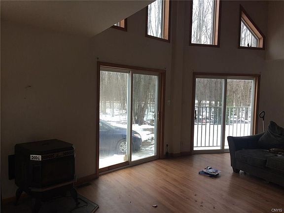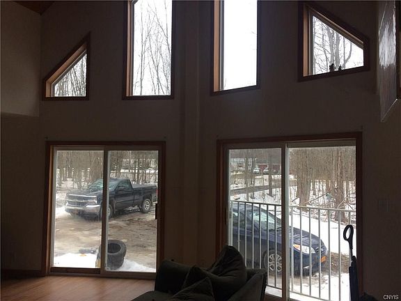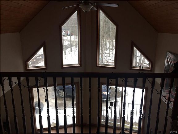 10 year old contemporary modular with open floor plan - kitchen/living/dining combination - two bedrooms and two full baths on the main floor- large bedroom and full bath on the second floor - also a second floor loft looks over the living room that has floor to ceiling windows - full basement is dry and could be used for more living space - forced air propane furnace with central air - some trim work and painting needed - pellet stove is negotiable.