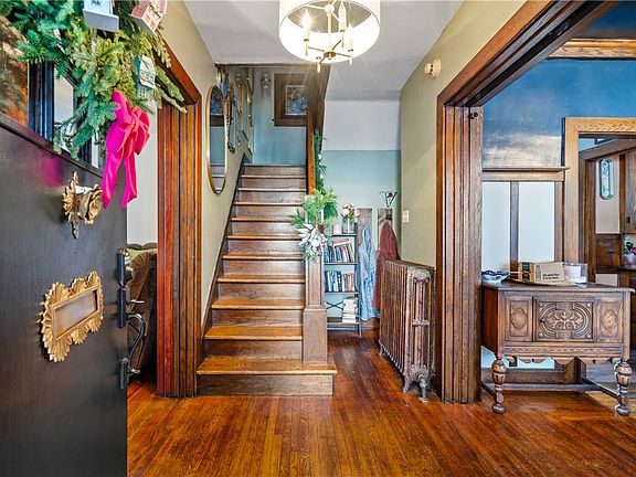 This great stately brick home will attract you with the large oversized covered front porch that opens to the center entry that offers the formal living room and dining room on each side. There is original hardwood flooring throughout the house along with stunning stained woodwork, 5 decorative fireplaces, built-in oak China cabinets and 2 stair cases with oak railing to 2nd and 3rd floors. Up to date stainless kitchen (new dishwasher/refrigerator 3/2024) to create your favorite meals w/back staircase to second floor and walk out to covered porch. The 2nd floor offers a Full Bath that features a Clawfoot Tub with shower and original stained-glass window, 4 bedrooms and walkup to open 3rd floor with great walkable finished space. Basement is unfinished, with Laundry Room that leads to the back yard. Minutes to Pittsburgh and Major Mall. Conveniently located to shopping, parks, Busway I79 and all major roadways for all of your needs. Sewer line replaced 1/2024 and new porch roof 7/2024.
