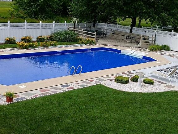 Ready for Summer Check out this well maintained 2 story Colonial with a beautiful in-ground pool. 4 beds , 2.5 baths plus a partially finished lower level. Oversized garage, fits 2 small cars tandem, currently being used as a 4 Season room with it's own heating and air conditioning and french doors that lead out to a fenced in backyard oasis . Heated 20 x 48 inground pool, with new liner and new pump, deck for entertaining, basketball hoop concrete area, and large shed that doubles for storage as well as an additional 1/2 bath in rear for easy pool access. Formal Dining room has hardwood floors, large front window, crown molding and chair rail. Very large sunlit living room w/ front bay window and plush carpeting. Kitchen features a eat at bar top area, lots of countertop space and cabinets, all kitchen appliances stay. 1st floor laundry room . Additional family room on 1st floor complete with ceiling fans and Gas Burning Fireplace. Upstairs find 4 bedrooms all with berber carpeting and ceiling fans. Owner's suite features a full bath w/ stand up shower. Finished den in lower level plus tons of storage space/ workshop area too. Replacement windows through out. 1 Yr. HSA home warranty included