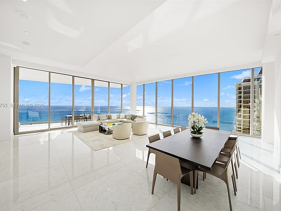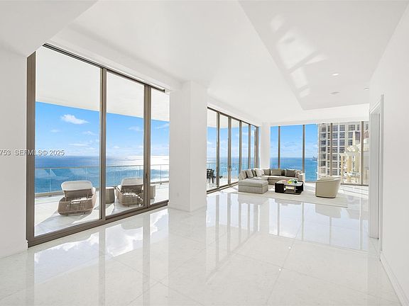 The most highly sought-after and rarely available unit type at The Estates at Acqualina, coined The World's Finest Residences! Located on the coveted south corner with endless views of the turquoise Atlantic and Miami's glittering downtown skyline, the 45th floor is unique with vaulted 12'6" ceilings lending to the residence's already-grand feel. Generous outdoor space featuring more than 1100sf of balconies with an oceanfront outdoor sauna. Impressively spacious layout with oversized great room ideal for families and for entertaining, separate family room, 4 bedrooms (convertible 5th), chef's kitchen with dual La Cornue gas ranges and other top-of-the-line appliances by Sub-Zero and Miele, luxurious/upgraded stone finishes including white onyx in all bathrooms with Dornbracht fixtures and Toto washlets. Enjoy the convenience of complete smart-home automation for lighting, audio/visual, climate and window shades. Bar-none, Miami's most luxurious oceanfront enclave with five-star world-class services and amenities that include Rolls Royce House Cars, five restaurants featuring Estiatorio Avra, Il Mulino and KeUh, three pools complete with FlowRider and waterslide, daily breakfast, cinema, skating rink, bowling alleys, F1 and golf simulators, basketball court, soccer field, and dedicated concierges.